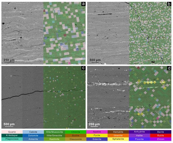 RoqSCAN SEM-EDS photomicrographs of lacustrine shale samples from the Shahezi Formation (JLYY1 borehole, Lishu Rift Depression, Songliao Basin), showing four types of laminae: (a) 3125.15 m depth, calcareous laminae; (b) 3125.15 m depth, non-clay mineral silicate laminae; (c) 3155.5 m depth, argillaceous laminae; and (d) 3138.4 m depth, pyrite laminae.