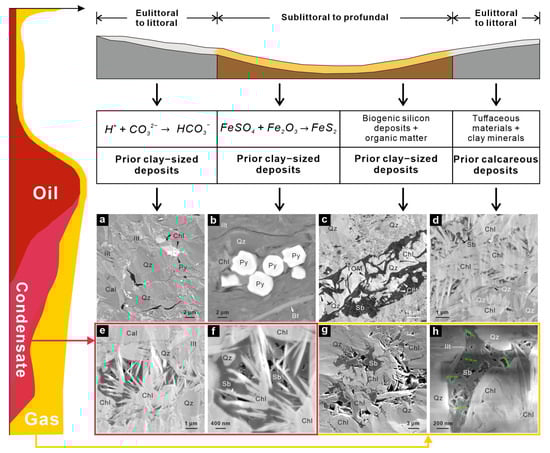 An interesting phenomenon is seen in Figure 8e,f, where the clay mineral assemblages are associated with calcite particles within micro-scale organomineral composites. These formations resemble structures that likely result from the devitrification of volcanic glass into chlorite and illite. Although it remains uncertain whether this process directly influences organic matter evolution, it is clear that the combination of volcanic glass, organic matter, and calcite in a special diagenetic setting contributes to hydrocarbon-rich shales.