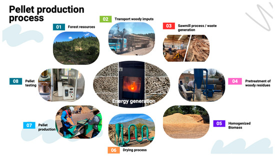 In 2024, six random samples of 5.0 kg each were collected according to UNE-CEN/TS 14778-1 [27], generating a composite sample of 202 kg of by-products derived from the harvest of rice and cacay at the Llanos Orientales Region (Orinoquía), in the department of Meta, Colombia. For the biomass collected in México, a composite sample of 15 kg of each plant species was obtained from five random samples taken from the sawmill (Aserradero) waste banks of the company Maderas y Pisos Intermex, Predio la Foresta, Balancán, Tabasco. The geographical location is 17° 52′ 16.29′ N and 91° 26′ 57.17′ W. Table 1 shows the biomass type collected in both countries, considering different plant organs. The pellet production process for all sources was according to the Figure 1.