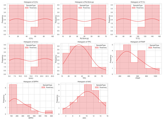 Histograms with kernel density estimates showing the distribution of extraction parameters and antioxidant response variables for rosemary samples. While extraction settings are uniformly distributed due to the design structure, antioxidant responses such as FRAP and DPPH exhibit skewed distributions, indicating variability in sample performance.
