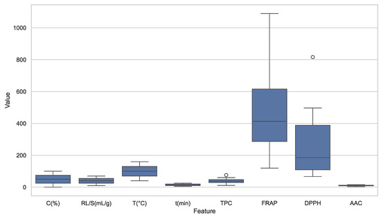 To assess variability and central tendencies, a combined boxplot was created (Figure 2). The extraction parameters (C, RL/S, T, and t) showed narrow interquartile ranges and symmetry, indicating controlled conditions. In contrast, the antioxidant responses—especially FRAP and DPPH—exhibited wide variability and outliers, reflecting greater sensitivity to extraction settings. TPC showed moderate spread, while AAC remained tightly clustered. These patterns suggest that antioxidant outcomes are more affected by experimental variation than the input parameters.