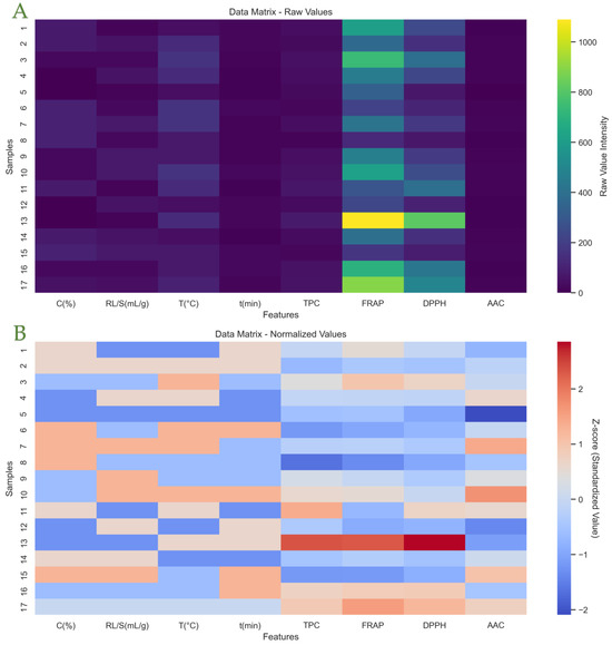 Plot (A) is a heatmap of raw data values for extraction parameters and antioxidant responses across 17 experimental conditions. Brighter colors indicate higher absolute values. The most intense FRAP activity was observed in sample #13. Plot (B) is a z-score normalized heatmap of the same dataset. Standardization enables direct comparison across all features. Red shades represent values above the mean, while blue shades indicate values below the mean. Strong positive deviations in FRAP and TPC are evident in sample #13.