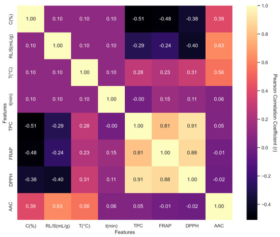 To explore the variable relationships, a Pearson correlation matrix was computed (Figure 4). Strong positive correlations between TPC, FRAP, and DPPH (r = 0.81–0.91) indicate phenolics’ central role in antioxidant capacity. The ethanol concentration (C, %) was negatively correlated with both TPC and FRAP, suggesting diminishing returns at higher concentrations. The temperature and solvent ratio showed moderate positive correlations with AAC, while the extraction time had minimal influence on any response. These findings align with the heatmap results and underscore the compound-specific effects of extraction parameters.