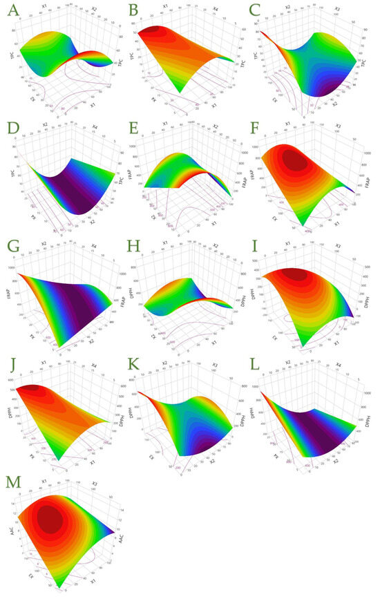TPC, showing the (A) covariation of X1 (ethanol concentration, C, % v/v) and X2 (liquid-to-solid ratio, R, mL/g); (B) covariation of X1 and X4 (extraction time, t, min); (C) covariation of X2 and X3 (extraction temperature, T, °C); and (D) covariation of X2 and X4. FRAP, showing the (E) covariation of X1 and X2; (F) covariation of X1 and X3; and (G) covariation of X2 and X4. DPPH, showing the (H) covariation of X1 and X2; (I) covariation of X1 and X3; (J) covariation of X1 and X4; (K) covariation of X2 and X3; and (L) covariation of X2 and X4. AAC, showing the (M) covariation of X1 and X3.