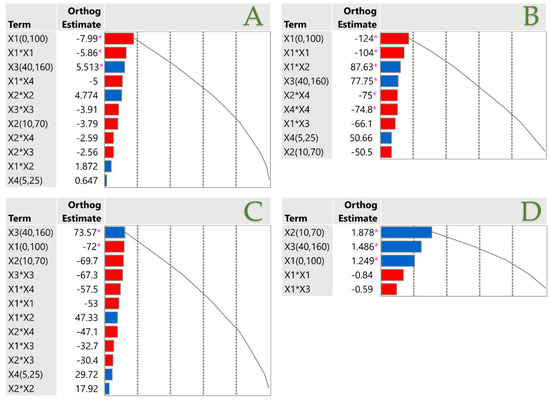Pareto plots illustrating the significance of parameter estimates for the PLE technique across TPC (A), FRAP (B), DPPH (C), and AAC (D), with a pink asterisk marking significant values (p < 0.05). Positive estimates are shown in blue, while negative ones are represented in red.