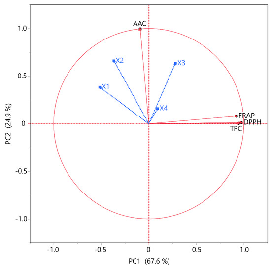 In addition, the MCA provides further insights into the interrelationships between variables. The primary benefit of this approach is its ability to determine the degree of positive or negative correlation between the variables under investigation. Table 5 delineates the results of this investigation. The pattern of robust positive correlations (>0.77) between antioxidant assays and total phenolic content (TPC) was previously substantiated [26]. Ultimately, the negative correlation between ascorbic acid (AAC) and all other responses (TPC, FRAP, and DPPH) is highly emphasized. Nevertheless, it is particularly noteworthy that molecules exhibiting considerable antioxidant activity demonstrate a negative correlation with antioxidant assays.