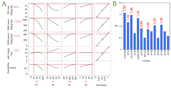 The PLS model was employed to assess the influence of the extraction condition parameters (X1, X2, X3, and X4). Figure 8 illustrates the prediction profiler alongside a desirability function that features extrapolation control and includes a variable importance plot (VIP). The extraction of bioactive compounds is significantly influenced by various factors, with temperature, solvent composition, and extraction duration being the most critical [27]. Initially, it is important to note that the extraction process can be complicated by the differing solubility and polarity of polyphenols [28]. Concerning the PLE technique, it is evident that the X1 parameter exhibited the most statistically significant impact (p < 0.05) compared to other parameters in the extraction process, as demonstrated by the Variance Importance Plot (VIP) presented in Figure 8B. The observations previously noted from the 3D models of the response surface were corroborated in Figure 8A, indicating that the optimal concentration was 25% v/v aqueous ethanol, a liquid-to-solid ratio of 10 mL/g, and the optimal temperature was 160 °C. The high efficiency observed at 160 °C is likely due to the enhanced solubility of polyphenols and increased solvent penetration into plant material. Elevated temperatures reduce surface tension, improving mass transfer and extraction yield. Concerning the duration of extraction, it appeared to exert the least significant influence on the process; consequently, the longest duration was favored, as it favored AAC recovery. The extraction process was not significantly influenced by the temperature or extraction duration; nevertheless, elevated temperatures coupled with long extraction times were favored. The solute–matrix interaction can be significantly reduced by the PLE technique, which is primarily due to the influence of van der Waals forces or hydrogen bonds, particularly in the presence of elevated temperature and pressure. This reduces energy demands, improves the efficacy of solute molecular extraction, and decreases the viscosity of the solvent. This reduces the solvent’s resistance to the matrix, thereby facilitating its diffusion into the sample [29]. The model exhibited a prolonged extraction duration, as prior research has substantiated the effectiveness of both brief [30] and prolonged [28] intervals. While elevated temperatures facilitate the extraction of bioactive compounds by enhancing their solubility in other techniques, like stirring [31], it is important to note that many thermolabile compounds may experience degradation under these conditions [32].