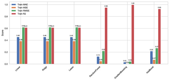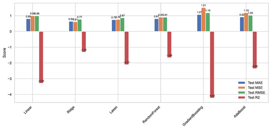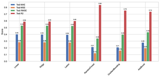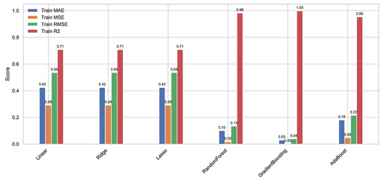 In this study, the performance of the regression models was evaluated using four standard metrics: Mean Absolute Error (MAE) [21], Mean Squared Error (MSE) [21], Root Mean Squared Error (RMSE) [22], and the Coefficient of Determination (R2) [23]. These metrics quantify the difference between the predicted values and actual experimental values , based on a total of n observations.