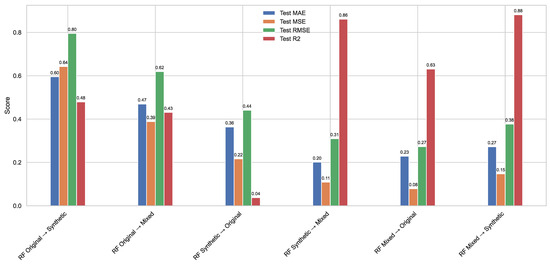 Cross-dataset evaluation of the RF regression model trained on the original, synthetic, and mixed datasets. Each group of bars represents the performance metrics MAE, MSE, RMSE, and R2 obtained when the model trained on one dataset was tested on another. Results highlight the generalization ability of each training regime across data domains. Models trained on the mixed dataset showed superior cross-domain performance, particularly when evaluated on both the original and synthetic test sets.