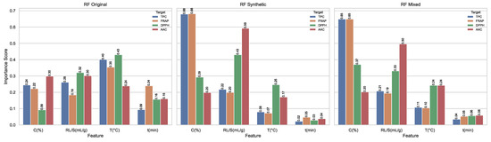 To investigate how the model training data influences the learned relationships between extraction parameters and antioxidant responses, feature importance scores were extracted from each RF model trained on the original, synthetic, and mixed datasets. These scores were derived from the individual estimators trained for each target (TPC, FRAP, DPPH, and AAC), and visualized side by side (Figure 16).