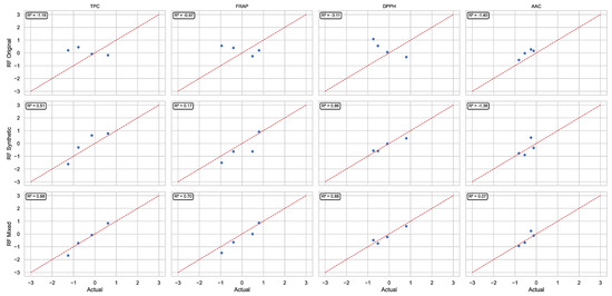 The RF-based model trained on the mixed dataset, which combined both the original and synthetic samples, delivered the most balanced and reliable performance. TPC and DPPH both achieved strong fits with R2 values of 0.88, while FRAP also performed well with R2 = 0.70. AAC, however, remained a challenging target, with only a marginally positive R2 of 0.07. The mixed data approach thus demonstrated the strongest generalization overall, effectively integrating the empirical variability of real measurements with the expanded coverage of synthetically generated patterns.