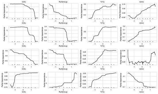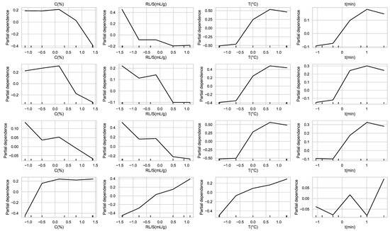 For the model trained on the original dataset, PDPs (Figure 18) revealed generally smooth but shallow response curves, indicating low model sensitivity to input variation. The results of C (%) and RL/S showed modest negative slopes for most targets, particularly TPC and FRAP, suggesting that higher solvent concentrations and solvent ratios tended to reduce predicted antioxidant values. Temperature exhibited a more pronounced positive relationship with TPC and FRAP, while time (t) influenced predictions positively in nearly all cases, though effects on AAC appeared erratic. These modest trends are consistent with the limited representational power of the model trained on the small original dataset, which likely restricted the learned functional relationships to low-variance approximations.