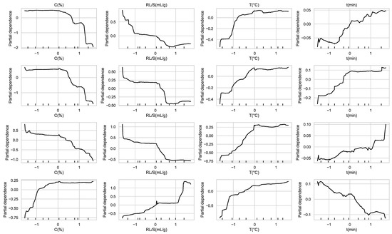 The model trained on the mixed dataset (Figure 20) presented the most coherent and biologically plausible trends. The PDPs across targets demonstrated well-defined, monotonic relationships. C (%) consistently showed negative associations with antioxidant capacity, while RL/S exhibited declining effects, particularly for FRAP and TPC. Temperature maintained a strong positive relationship, especially for DPPH and FRAP. Extraction time (t) showed clear and mostly monotonic increases in partial dependence, indicating its significant influence on yield-related outcomes. Compared to the other models, the mixed-trained model exhibited more stable and interpretable PDPs, which is consistent with its higher predictive accuracy and generalization capacity.