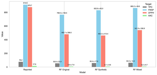 Comparison of predicted versus reported antioxidant values under optimal extraction conditions using RF-based models trained on the original, synthetic, and mixed datasets. Bars represent predicted values for TPC, FRAP, DPPH, and AAC, with numeric labels showing predicted value ± absolute error relative to the experimentally reported values. The mixed model produced the most accurate predictions overall, with reduced errors across most targets.