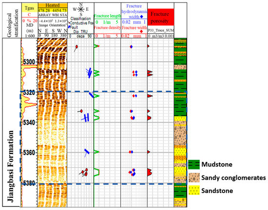 Based on the above findings, a field application was conducted in the Jiangbasi Formation of Well XX6 in the Junggar Basin. The reservoir is characterized by a mudstone–sandy conglomerate–sandstone sequence. Casing fracturing was implemented in three intervals with a total thickness of 11.2 m. The fracturing strategy focused on intervals with low interlayer horizontal stress differences (3–4 MPa), using a high injection rate of 14 m3/min and alternating injections of medium- and high-viscosity fracturing fluids. This approach facilitated both vertical cross-layer propagation and the relatively uniform lateral propagation of hydraulic fractures. Following the treatment, the well achieved daily gas production of 6581 m3 and daily water production of 31.96 m3, indicating effective multi-layer stimulation and sufficient vertical reservoir activation.