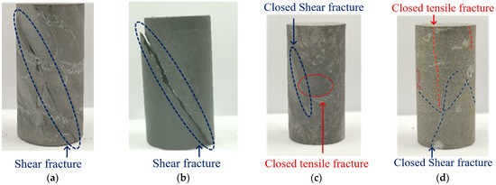 Failure modes of core samples from triaxial compression tests. (a) Sample 1. (b) Sample 2. (c) Sample 3. (d) Sample 4.