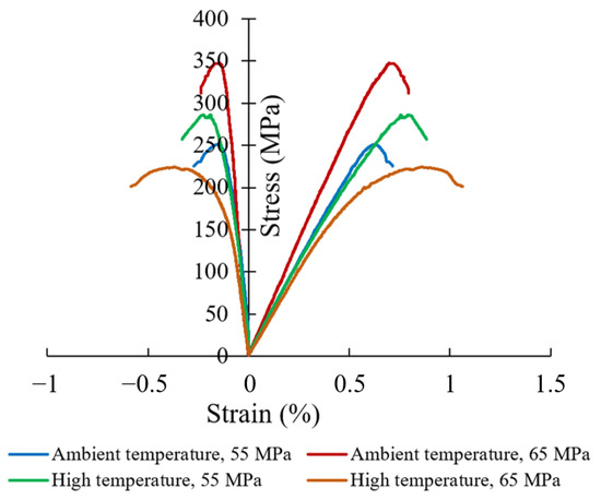 The stress–strain curves of the core samples under different simulated depth conditions are presented in Figure 3. Under ambient temperature conditions at confining pressures of 55 MPa and 65 MPa, the samples predominantly exhibited brittle failure. The axial stress–strain curves displayed a linear trend prior to reaching peak stress, followed by a rapid stress drop after failure. Under high-temperature conditions, when the confining pressure was 55 MPa, the stress–strain curve and failure mode still indicated primarily brittle behavior, although a distinct pre-peak yield stage was observed. Compared to the curve under ambient temperature conditions, the initial portion of the stress–strain response remained nearly identical, but deviations appeared near the peak due to the onset of ductile deformation. At 65 MPa confining pressure and high temperature, both the stress–strain curve and failure mode indicated that the sample underwent a brittle–ductile transition, characterized by a pronounced pre-peak yield stage. After reaching peak stress, the stress decreased at a significantly slower rate, and the energy required for failure markedly increased. Compared to the response observed at 65 MPa under ambient temperature conditions, the combined effects of high temperature and confining pressure led to substantial changes in mechanical behavior, highlighting the influence of the brittle–ductile transition. These results confirm that for rocks in this region, depths between 5500 m and 6500 m, corresponding to confining pressures of 55–65 MPa and gradually increasing reservoir temperatures, represent the critical range for the brittle–ductile transition.
