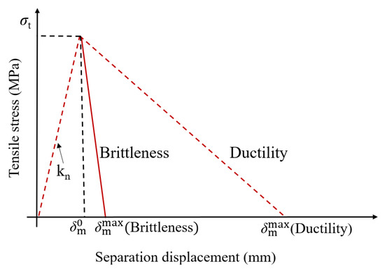 After that, the constitutive curve exhibited linear softening behavior, as shown in Figure 4, and D increased linearly from 0 to 1. When the separation displacement reached its critical value, the interface produced irreversible complete damage, and the interface was detached. The expression of damage factor is as follows [24]:
