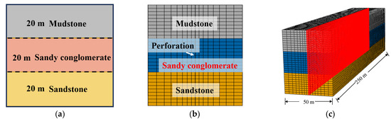Numerical model of hydraulic fracturing in a tight sandy conglomerate reservoir. (a) Schematic of the stratigraphic layering. (b) Schematic of the layered numerical model. (c) Mesh configuration of the three-dimensional model.