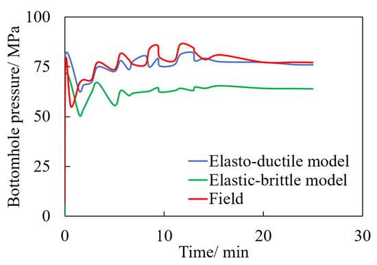Numerical simulations were conducted using both the cohesive zone brittle constitutive model and the cohesive zone ductile constitutive model. The corresponding bottomhole pressure–time curves are shown in Figure 7. In the brittle model, the simulated breakdown pressure was 70.2 MPa, and the injection pressure required for stable fracture propagation ranged from 60 to 64 MPa. In contrast, the ductile model yielded a higher breakdown pressure of 80.2 MPa, with a stable propagation pressure range of between 60 and 80 MPa. Field data analysis indicated that the actual breakdown pressure was 78.3 MPa, and the injection pressure for stable fracture propagation ranged from 61.7 to 85.95 MPa.
