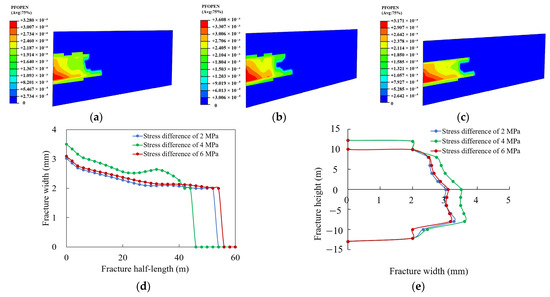 The initiation of a hydraulic fracture requires fluid pressure to exceed both the tensile strength of the rock and the minimum horizontal principal stress. As the interlayer horizontal stress difference increases, the minimum horizontal stress in the barrier layer also increases, enhancing the barrier layer stress effect and making it more difficult for fractures to initiate and propagate across the barrier layer. As shown in Figure 8a, when the interlayer horizontal stress difference was 2 MPa, the hydraulic fracture propagated vertically, penetrating both the upper and lower layers. A larger proportion of the fracturing fluid entered the sandstone layer, which has a lower Young’s modulus and higher porosity, resulting in a wider fracture width near the sandstone interface and greater fracture length. When the interlayer horizontal stress difference increased to 4 MPa (Figure 8b), the fracture width increased while the fracture length decreased. At an interlayer horizontal stress difference of 6 MPa (Figure 8c), the enhanced barrier layer stress effect significantly inhibited upward fracture propagation, while the overall fracture length increased. As shown in Figure 8d,e, under the same total fluid volume, increasing the interlayer horizontal stress difference led to a reduction in fracture height, a significant increase in fracture length, and improved lateral fracture development within the central reservoir layer.