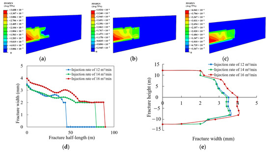 Variation in fracture propagation morphology with injection rate. (a) Injection rate of 12 m3/min. (b) Injection rate of 14 m3/min. (c) Injection rate of 16 m3/min. (d) Fracture width profile. (e) Fracture height profile.