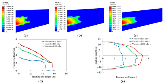 As shown in Figure 10a, when the viscosity of the fracturing fluid was 10 mPa·s, vertical lithological heterogeneity within the reservoir significantly influenced the geometry of the hydraulic fracture. Along the fracture length direction, the width of the central fracture exhibited substantial fluctuations, with a low degree of opening at the fracture tip. Vertically, the fracture width was narrower in the upper reservoir and wider in the lower reservoir, indicating a non-uniform distribution. When the viscosity increased to 50 mPa·s (Figure 10b), the higher viscosity fracturing fluid effectively reduced fluid leak-off during the fracturing process. This enhanced the fluid volume available for driving fracture propagation, decreased the pressure drop gradient within the fracture, and led to increases in both overall fracture width and effective fracture length. The variation pattern of fracture width along the fracture length direction transitioned from irregular fluctuations to a more linear decreasing trend. At a viscosity of 100 mPa·s (Figure 10c), the overall fracture width increased further. Vertically, the distribution pattern of fracture width changed from a gradual top-to-bottom decrease to a configuration with maximum width in the middle reservoir and smaller widths in the upper and lower layers. As shown in Figure 10d,e, for tight sandy conglomerate composite reservoirs, high-viscosity fracturing fluids can increase flow resistance within the fracture, significantly enhance fracture width development in the central reservoir, and promote greater fracture length propagation. At the same time, fluid entry into the upper and lower layers is suppressed, thereby improving the uniform propagation of fractures within the target middle layer.