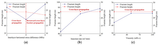 Fracture length–height competition diagram under different influencing factors. (a) Interlayer horizontal stress difference. (b) Injection rate. (c) Fracturing fluid viscosity.