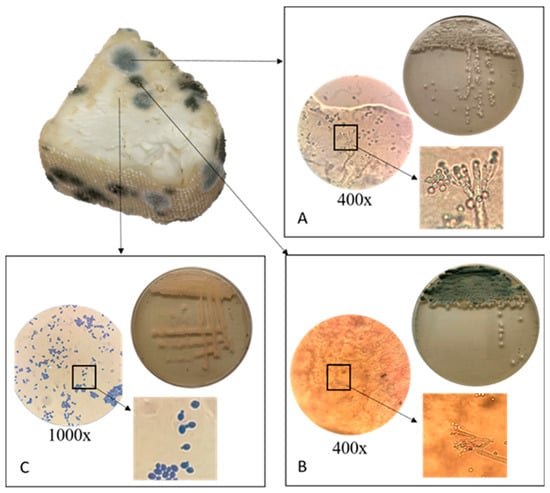 Isolation and identification of spoilage microorganisms from white cheese: microscopic and cultural morphology of Penicillium spp. (A,B) and Saccharomyces spp. (C).