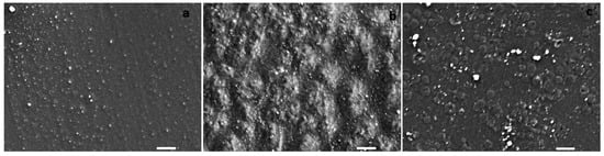 SEM images of polymer films surface (a) PLA, (b) PLA-C-2, (c) PLA-10 [bar scale: 10 μm].
