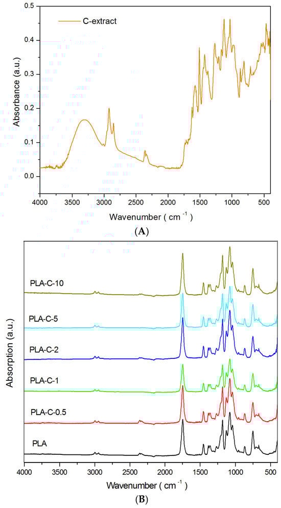 (A). FTIR spectrum of dried C-extract. (B). FTIR spectra of PLA and PLA-C films.