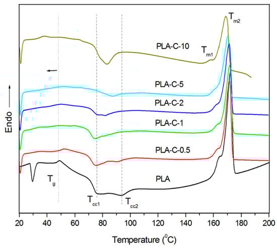 The DSC curves are shown in Figure 4, and all relevant data derived from the measurements are summarized in Table 1. Only the first heating runs (without erasing the thermal history) were evaluated, in order to present the actual structural behavior of the obtained films and to link these results with the other measured properties. The DSC curve of the pure PLA film was characterized by a glass transition temperature at 47 °C, followed by cold crystallization exo peaks (at 76 °C and 94 °C) and a melting endotherm around 172 °C with a shoulder peak at 164 °C. The increased content of the C extract influenced the lowering of Tg (up to 35 °C for the PLA-C-10 film) and the decrement of cold crystallization peaks, confirming the plasticizing effect of the C extract. Similar data were reported in the literature, confirming the plasticizing effect and good distribution of curcumin within the polymer chains [45,54]. The melting peak in all investigated films was around 171 °C, accompanied by a shoulder peak showing slightly decreased values in the PLA-C-10 film. The estimated degrees of crystallinity increased with the increasing C-extract content. In addition to the plasticizing effect, C-extract molecules caused the arrangement of the PLA chains and acted as a nucleating agent [55].