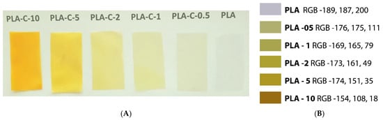 (A). PLA films examined in this study. (B). RGB coordinates for each of the examined composite films (obtained by use of software: https://colormine.org).