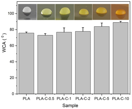 The contact angle measurements of all polymer films are presented in Figure 6. As it was found, PLA showed a low hydrophilic character, with a contact angle of 75.8 ± 1.2°. The WCA of the polymer films loaded with C extract showed an increase in the measured values (up to 88.9 ± 1.4°) due to the addition of C extract. These increased values were predominantly due to the hydrophobic nature of the curcuminoid molecules. The results demonstrate that the addition of the C extract would result in a decreased surface wettability of the polymer films. Similar observations were noted in the literature [58,59].