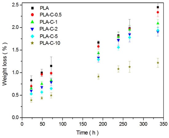 The materials used in food packaging are usually exposed to external influences, such as temperature and UV exposure. The photodegradation of the polymer film was followed within 14 days and is presented in Figure 7, as mass changes of the polymer film versus time of UV exposure. It could be noted that the pure PLA film degraded by 2.4% for the whole period of UV exposure, and these data are in accordance with the previously published results [62]. The addition of extract of various contents caused a decrease in PLA photodegradation (up to 1.25% for TPU-C-10). This behavior could be related to the phenolic structure of all curcuminoids present in the extract, which acts as a UV stabilizer of the PLA. This positive effect of the curcumin present in polymer films has already been noted in the scientific literature [63].