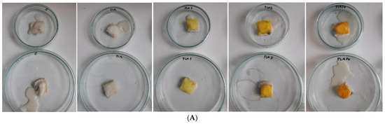 The same type of white cheese used for isolating spoilage microorganisms was aseptically cut into cuboid pieces (3 cm × 3 cm × 1 cm, length × width × height). Each cheese piece was layered on the top surface with PLA films containing different concentrations of curcuma extract (direct contact analysis [15,44]). The samples were placed in sterilized glass Petri dishes and stored at a constant temperature of 21 °C. Visual observations of spoilage (e.g., mold growth, color changes) were recorded daily over a period of 16 days.