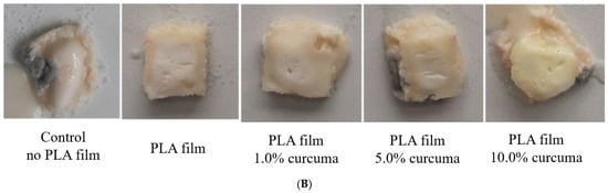 No noticeable difference in the spoilage rate (microbial growth, color, or texture changes) was observed between the PLA films with and without curcuma extracts (Figure 10). All cheese pieces covered with PLA films retained their white color, except at the edges where the film ended, and yellowing occurred. No visible microbial colonies (yeast or mold) appeared on the contact surfaces throughout the storage period. Texture degradation was minimal, except for the cheese pieces covered with PLA films containing 10.0% curcuma extract, where noticeable texture disruption was recorded. This could be attributed to the increased brittleness and decreased flexibility of the films with higher curcuma content, which may have reduced contact between the film and the cheese surface, allowing localized decomposition.