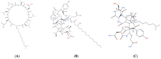 Chemical structure of biosurfactants (A) surfactin, (B) fengycin, and (C) iturin A (https://app.molview.com/).