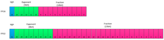 where s denotes the sign bit, occupying 1 bit, and when s = 0, it means that the floating-point number is positive; when s = 1, it means that the floating-point number is negative. e is the unsigned integer in the exponent bit, bias is the offset, which is used to express the exponent as an unsigned integer and the formula of bias (n is the number of exponential digits), and obtains the exponential value. f is the fractional part of the fractional digit representation; f is greater than or equal to 0 and less than 1. According to Equation (1), it can be calculated that the value of FP16 is in the range of −65,504 to 65,504 and is set to 0 if exceeded. FP32 has a wider range.