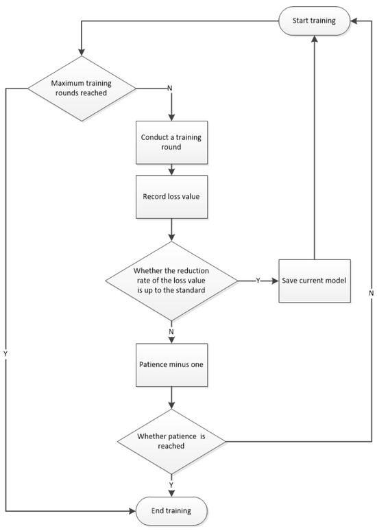 Early stopping has been shown to represent an effective regularization method by monitoring the validation set performance and terminating training before overfitting occurs [19]. The systematic study of the early stopping method has shown that it can significantly improve the generalization ability of the model. The core idea of early stopping is to monitor the performance of the model on the validation set during the training process. As the training progresses, the loss of the model on the training set usually decreases, and the accuracy and other indexes increase. However, after a certain point, the model’s performance on the validation set may no longer improve or even begin to decline, which means that the model may have begun to overfit; i.e., the model performs well on the training set but is less able to generalize to new and unseen data. The early stopping method means stopping training early when this trend of no improvement in the validation set performance is observed, so as to avoid overfitting the model by continuing training, and to improve the generalization ability of the model, as well as to save computational resources.