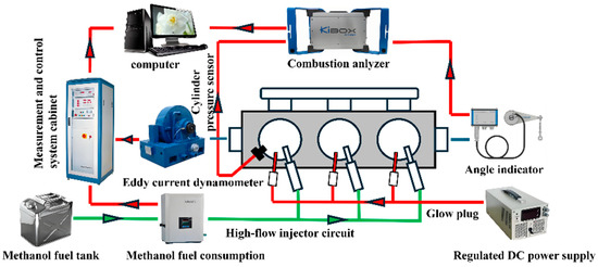 A three-cylinder machine equipped with electric plugs for transformation has a transformation program for 1. the electric plugs’ access to an independent power supply so that they remain in a red-hot state; 2. the use of special high-flow injectors to ensure that the methanol injection volume can meet the test requirements; 3. the transformation of the engine’s low-pressure oil system to ensure that the engine has an oil supply. Figure 1 shows a schematic diagram of engine modification, and Table 1 provides a comparison of the engine’s technical parameters before and after transformation.