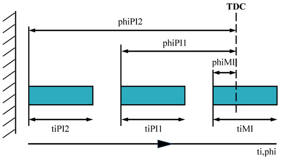 Figure 3 shows a schematic diagram of the crankshaft position for setting the injection parameters during the test. The engine was adjusted for two pre-injections during the test, defining the one close to the main injection (phiMI) as pre-injection 1 (phiPI1) and the one far from the main injection as pre-injection 2 (phiPI2). In addition, the pulse widths of pre-injection 2 (phiPI2), pre-injection 1 (phiPI1), and the main injection (phiMI) and the position principle of the top dead center (TDC) are defined in the diagram.