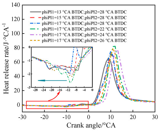 When the pre-injected methanol enters the cylinder, the temperature and pressure inside the cylinder will decrease to a certain extent, which can be verified by using the exothermic rate measured using the combustion analyzer. To visualize the exothermic rate under different pre-injection parameters, the pre-injection parameters shown in Table 5 were used to verify pre-injection control. Figure 4 shows the exothermic rate under different pre-injection timings. The green line represents the direction of the prejet away from the main jet. The results indicate that delaying the pre-injection timing (away from the main injection) causes the peak exothermic rate location to shift away from the main injection.