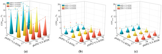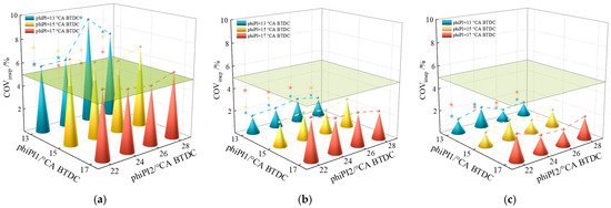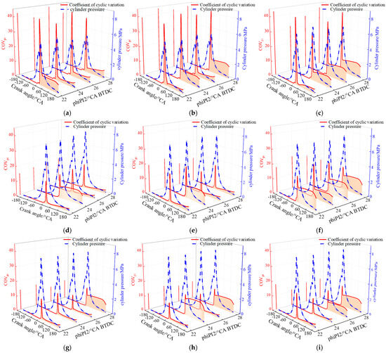 COV curves of in-cylinder pressure time series at each crankshaft angle: (a) rPI = 2:4; phiPI1 = 13 °CA BTDC; (b) rPI = 2:4; phiPI1 = 15 °CA BTDC; (c) rPI = 2:4; phiPI1 = 17 °CA BTDC; (d) rPI = 3:3; phiPI1 = 13 °CA BTDC; (e) rPI = 3:3; phiPI1 = 15 °CA BTDC; (f) rPI = 3:3; phiPI1 = 17 °CA BTDC; (g) rPI = 4:2; phiPI1 = 13 °CA BTDC; (h) rPI = 4:2; phiPI1 = 15 °CA BTDC; (i) rPI = 4:2; phiPI1 = 17 °CA BTDC.