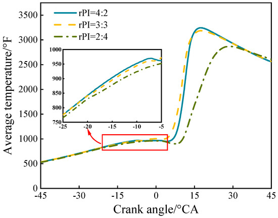 Figure 6 shows the cyclic fluctuation rate of the indicated average effective pressure. The dotted line represents the trend of the test results as the pre-spraying time changes, and the asterisk indicates the projection of the test results. The cyclic fluctuation rate of the indicated average effective pressure is often used to reflect the stability of the engine’s work. A value of less than 5% can be considered to be stable combustion; the figure is labeled with the cross-section of COVimep = 5% (Green plates in the figure). When the pulse width of pre-injection 1 increased above 3 °CA, the COVimep value of the engine was significantly reduced, by up to 8.12%. The reason for the reduction in COVimep is that pre-injection 1 ignition can significantly increase the cylinder temperature when the main injection of methanol enters the cylinder, which effectively reduces the risk of a misfire in the main combustion stage while advancing the start of combustion, which improves the effect on the quality of the main combustion due to the weakening of the air movement during the downward movement of the piston. The pre-spray 1 pulse width increased from 3 °CA to 4 °CA, and the heat generated by the pre-sprayed fuel had a reduced effect on the main combustion stage, while the decrease in the COVimep value was reduced. Figure 7 shows a schematic of the average in-cylinder temperatures for each pre-injection ratio at the pre-injection timing with optimal COVimep values (phiPI1 = 13 °CA BTDC, phiPI2 = 26 °CA BTDC).