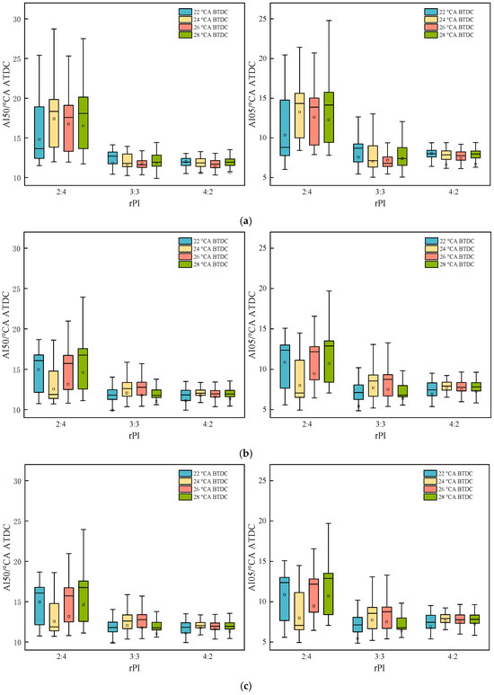The average value of the phase (AI05) of the combustion start point is small, and it can be seen from Equation (1) that when the denominator is small, a small change in the numerator can cause a large change in the COV value, which affects the analysis of the results. Therefore, the stability of the combustion start point was investigated using the quartile spacing statistical method. The same method was used to study the phase of the combustion center of gravity (AI50), which is conducive to analyzing the connection between the two fluctuations.