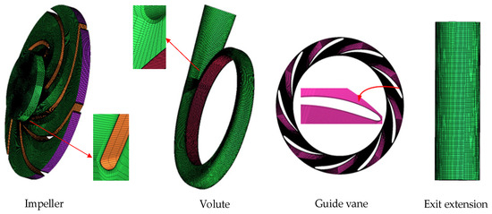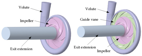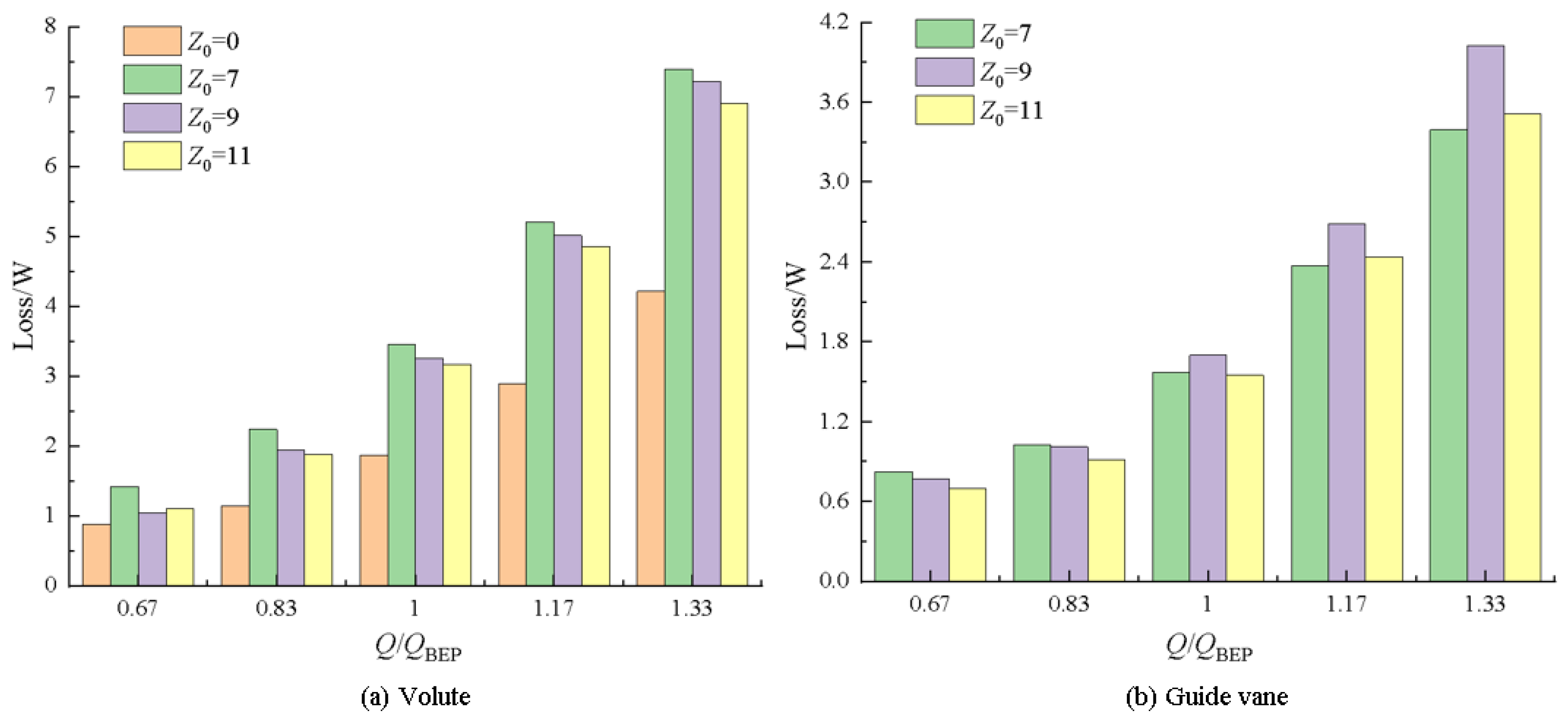 This study indicates that the number of guide vanes has a significant impact on the distribution of entropy production. In the future, we will further explore the synergistic effects of parameters such as the number of guide vanes, blade angle, volute throat area, and cutwater radius while optimizing various parameters to reduce entropy production and improve efficiency. In addition, a parameter prediction model based on machine learning could be used to establish a mapping relationship between the number of guide vanes, flow rate, speed, and entropy production, achieving rapid prediction and real-time optimization and providing decision-making support for industrial design. In addition, the medium of this study was clean water, and the problem of multi-physics field-coupling is more in line with reality. For example, the phenomenon of cavitation has a significant impact on energy loss under high-speed or low-pressure conditions. In the future, a cavitation model could be introduced to analyze the entropy production distribution in the cavitation area by combining entropy production theory to study the correlation between turbulent dissipation and entropy production during the collapse of cavitation bubbles. Under high-load operation, the deformation of the impeller and the increase in temperature may alter the flow field characteristics. The conjugate heat transfer model could be used to analyze the effect of the temperature gradient on entropy production.