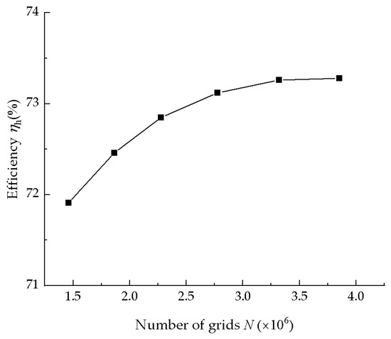 Hexahedral-structured mesh partitioning was performed on the impeller, volute, guide vanes, and exit extension using ICEM CFD 2022 R1; meanwhile, boundary layer meshing was implemented for the wall-adjacent regions of these four areas. The first-layer boundary mesh height was set at 0.005 mm, with a mesh growth rate of 1.2, resulting in a total of 20 layers of mesh, as shown in Figure 3. The y+ values for the SST k-ω turbulence model are shown in Table 2, and it can be seen that the y+ values were all less than 30. Therefore, this grid could perfectly capture the energy loss in the near-wall region [24,25]. In order to mitigate the impact of mesh density on the simulation outcomes, a mesh independence study was conducted for the original turbine model. The hydraulic turbine efficiency under optimal operating conditions served as the criterion, as shown in Figure 4. The results indicated that hydraulic turbine efficiency gradually stabilized as the mesh quantity increased. When the mesh number was approximately 3.31 million, the change in hydraulic efficiency was less than 0.2%. Finally, the mesh number selected for the original turbine model was 3.31 million, and the mesh number of the turbine model incorporating guide vanes was controlled to be around 4.2 million.