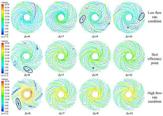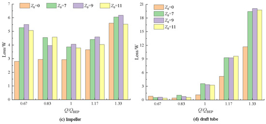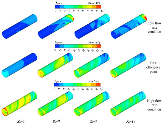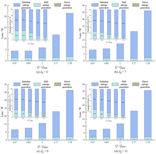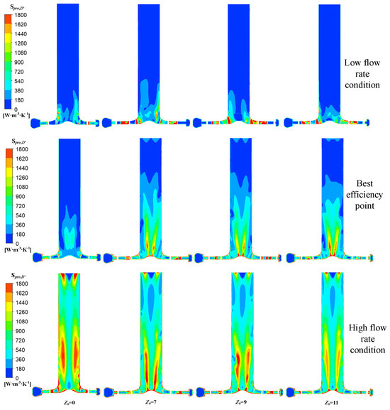 Figure 7 shows the variation diagrams of entropy generation losses for the flow components of the hydraulic turbine with different numbers of guide vanes under various operating conditions. Across diverse operational conditions, flow component entropy generation losses in turbine configurations without guide vanes demonstrated lower magnitudes than in models incorporating guide vanes. The entropy generation losses of each flow component increased with an increase in flow rate. When Q < 1.0 QBEP, the entropy generation losses followed the order from largest to smallest of impeller, volute, and draft tube. When Q > 1.0 QBEP, the draft tube exhibited the largest entropy generation loss followed by the impeller, with the volute showing the smallest loss. Regarding the turbine configuration incorporating guide vanes, losses within the volute, guide vanes, and draft tube showed a positive correlation with the flow rate. The impeller’s entropy production loss exhibited an initial decrease followed by a subsequent increase. When Q < 1.0 QBEP, the order of entropy generation losses from high to low was impeller > volute > guide vanes > draft tube. When Q > 1.0 QBEP, the order became draft tube > volute > impeller > guide vanes. Among them, the entropy generation loss of the draft tube increased most significantly. For Z0 = 0, it increased from 0.82 W at 0.67 QBEP to 11.68 W at 1.33 QBEP, and the proportion of the loss increased from 18.26% to 54.33%. For Z0 = 7, it increased from 0.55 W to 19.45 W, and the proportion of the loss increased from 6.81% to 52.68%. For Z0 = 9, it increased from 0.6 W to 20.1 W, and the proportion of the loss increased from 7.58% to 53.56%. For Z0 = 11, it increased from 0.41 W to 19.76 W, and the proportion of the loss increased from 5.63% to 55.33%. Under the optimal operating condition, the entropy generation losses of the flow components in the turbine without guide vanes followed the order from largest to smallest of impeller, volute, and draft tube. For the turbine with guide vanes, the entropy generation losses of the flow components were ordered as impeller > draft tube > volute > guide vanes. The proportions of entropy generation losses for the impellers of the Z0 = 0, Z0 = 7, Z0 = 9, and Z0 = 11 turbines were 49.24%, 30.52%, 32.79%, and 32.31%, respectively. After adding guide vanes, entropy production losses within the volute and draft tube components of the hydraulic turbine exhibited a gradual decline as the guide vane count increased. Based on the preceding analysis, it was evident that impeller entropy production losses represented a substantial portion of the total hydraulic turbine entropy production losses across various flow rates. Additionally, draft tube entropy production losses demonstrated the most pronounced variation with fluctuations in the flow rate. Consequently, the subsequent section is dedicated to analyzing the entropy generation loss mechanisms of the impeller and draft tube.