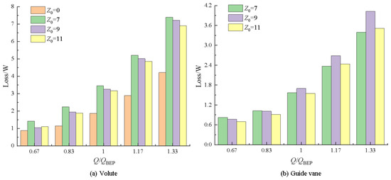 Figure 6 shows the variations in the entropy generation losses of hydraulic turbines with different numbers of guide vanes under various operating conditions. As the flow rate increased, turbulent entropy production losses in turbines with varying quantities of guide vanes demonstrated a continuous upward trend, while the wall entropy generation losses changed very little and the direct entropy generation losses were almost zero. This indicated that the impact of the flow rate on entropy generation losses was mainly caused by turbulent entropy generation. Due to the addition of guide vanes, the size of the volute changed and the optimal operating point of the turbine shifted towards higher flow rates. Therefore, even if the turbulent entropy generation loss of the hydraulic turbine was not significantly different after the addition of guide vanes, it was still greater than that of the model without guide vanes. As the flow rate increased, the velocity pulsation became more intense, resulting in a continuous increase in turbulent entropy generation loss and a slow increase in wall entropy generation. After adding guide vanes, wall entropy generation loss discrepancies in the hydraulic turbine were also minimal, suggesting that an augmented flow rate induced an elevation in the wall velocity gradient. The momentum exchange between different velocity layers intensified, resulting in an increase in the shear stress and, consequently, the wall entropy generation losses increased. Through a loss proportion analysis, the findings revealed that the share of turbulent entropy production losses exhibited a gradual upward trend. For the Z0 = 0 turbine, it increased from 70% at 0.67 QBEP to 91% at 1.33 QBEP, while for the hydraulic turbine after adding guide vanes, it increased from approximately 74% to 94%. Although the wall entropy generation losses increased slowly, their proportion in the total entropy generation losses continued to decrease. For the Z0 = 0 turbine, it decreased from 30% at 0.67 QBEP to 9% at 1.33 QBEP, and for the hydraulic turbine after adding guide vanes, it decreased from about 26% to 6%. Thus, the hydraulic turbine’s energy loss was predominantly attributed to the combined effect of turbulent entropy production induced by unsteady flow and entropy production due to wall friction. At the optimal operation state, the turbine’s energy loss for the Z0 = 0 configuration was 53.08%, 52.36%, and 49.74% lower than the Z0 = 7, Z0 = 9, and Z0 = 11 turbines, respectively.